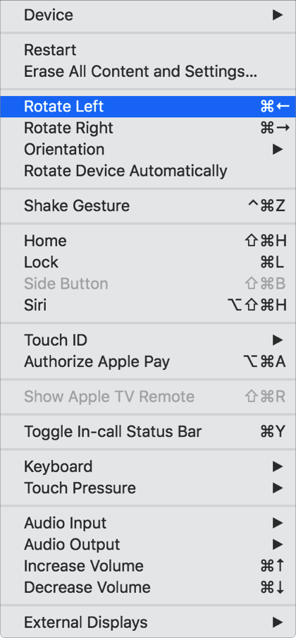 In Simulator, you can simulate a physical user action—such as rotating or shaking an iOS device—using the Hardware menu. You can also simulate touch gestures and simulate Apple Watch interactions using the Mac pointer.