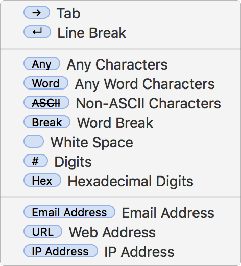 Use patterns to refine a search by adding placeholders for white space, URLs, hexadecimal digits and other characters into the search field.