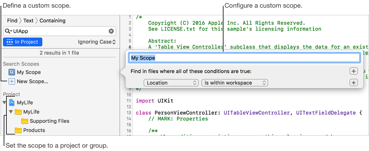 Click a project or group to restrict searching to that project or group, or click New Scope to define a custom scope. A custom scope can restrict searching to files matching a specific location, name, path, extension, type, and source control status.