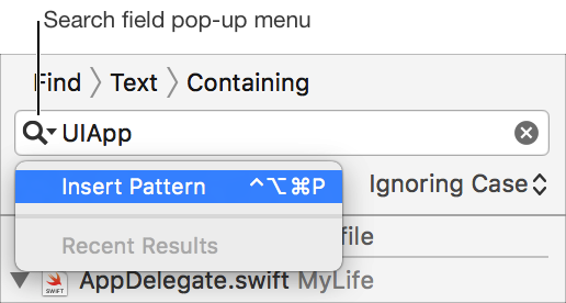 Select an option from the case sensitivity pop-up menu: Ignoring Case or Matching Case.