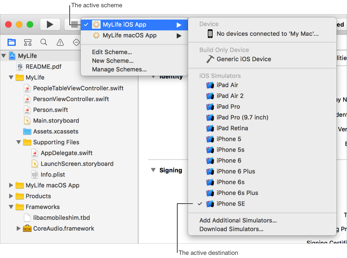 Switch the active destination: Choose a destination from the scheme menu in the toolbar.