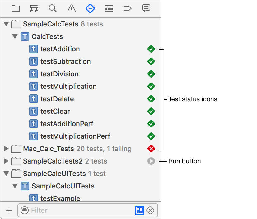 Use the Test navigator to run UI tests and unit tests that check the performance and behavior of your code.
