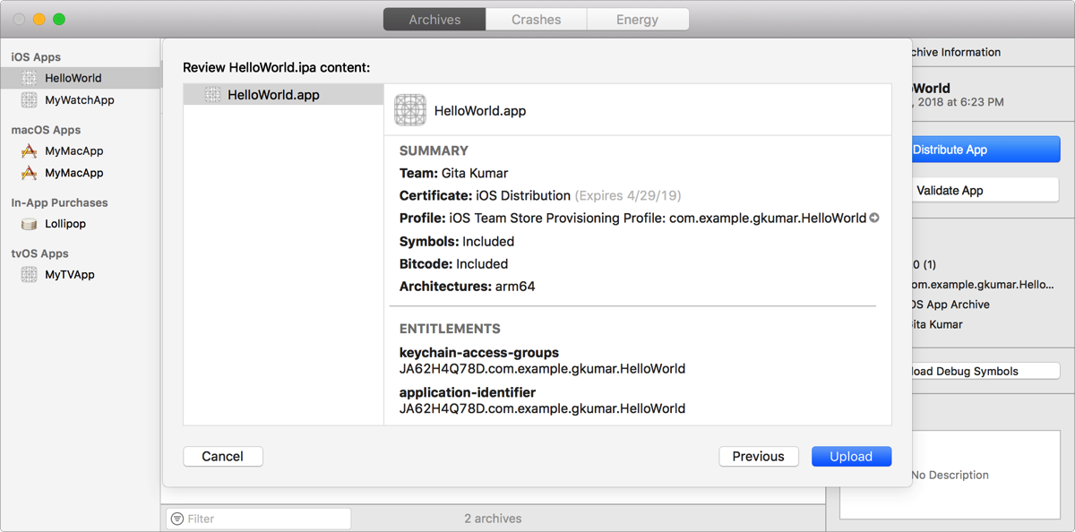 Alternatively, to export the app before uploading it, click Export, then click Next. Select a location for the files, then click Export. A folder containing the archive export files appears in Finder.