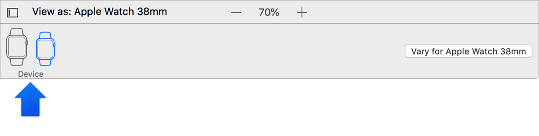 Select a device (iOS, watchOS): In the Device area, select a device. The device family you select appears next to “View as” in the layout bar. For iOS apps, select an iOS device family, and for watchOS apps, select a Apple Watch size.