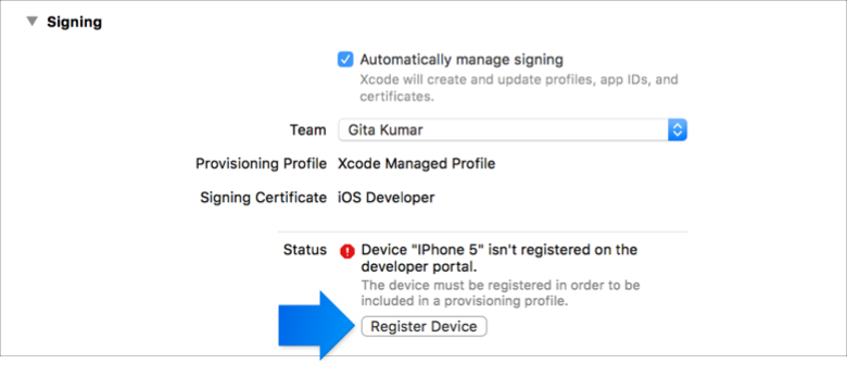 All iOS, tvOS, and watchOS apps must be code signed using a provisioning profile to launch on a device. macOS apps that use certain app services must be signed to launch too. If you use automatic signing (recommended), Xcode creates the necessary signing assets for you in your developer account. Although, you’ll need to explicitly register the device before running the app. For macOS apps, you register the Mac running Xcode.