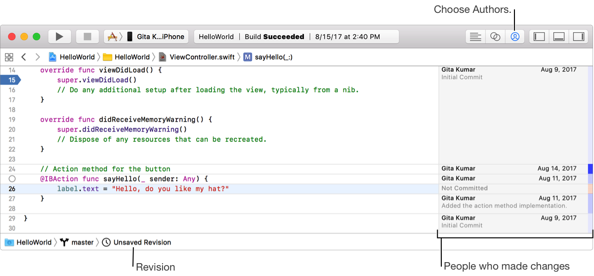 Use the version editor to compare revisions of your files that you commit to a source code repository, view the authors who committed changes, and display the log messages.