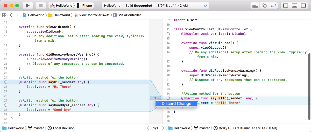 1. In the comparison editor, click a change in the gutter between the two revisions and choose Discard Change.