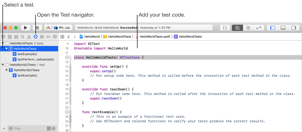 ), you can view and edit the code for these tests, and add additional tests. To write code using the XCTest framework, go to the XCTest.