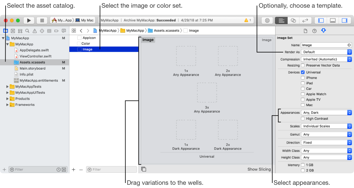 On macOS 10.14 and later, users can select light or dark mode in System Preferences. If you use system defaults, your assets automatically switch to a dark appearance when the system is in dark mode. Alternatively, provide specific appearances for assets in dark mode. Also provide light appearances if they differ from the Any appearances that are the default for light mode and used on earlier macOS versions.