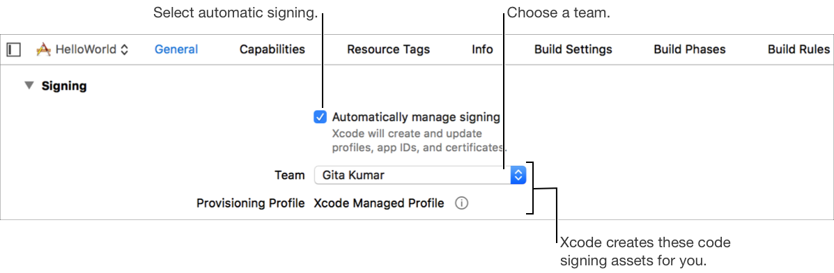 Automatic signing is a target setting that allows Xcode to manage signing assets for you. The signing settings are located in the General pane under the heading Signing in the project editor. To enable automatic signing, select “Automatically manage signing.”