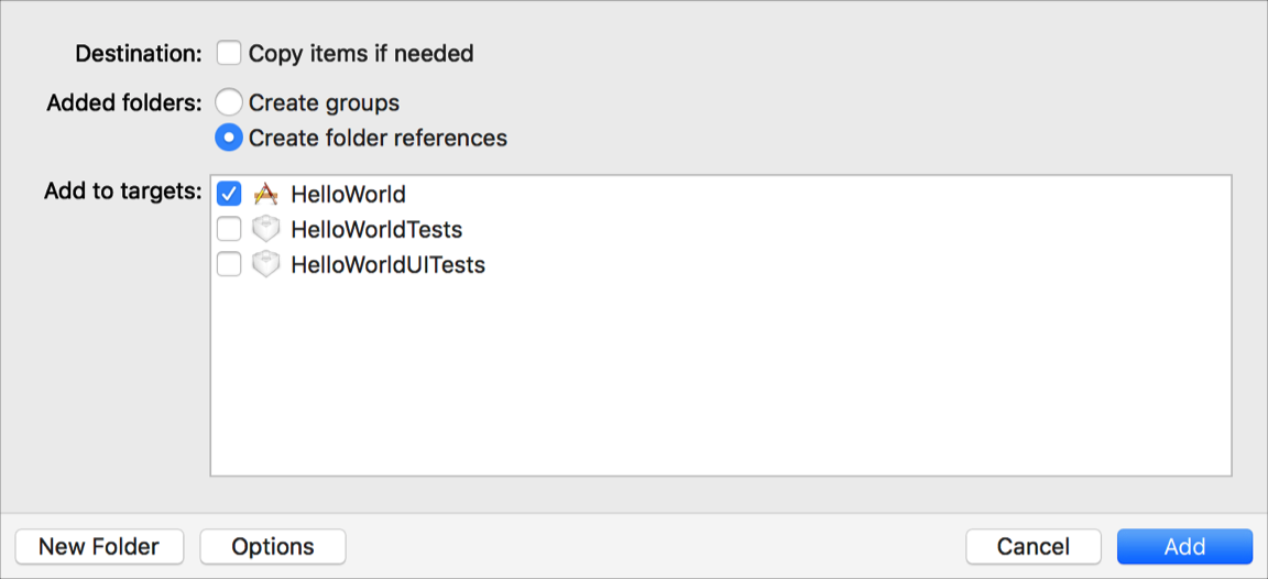 Create folder references: Displays the folders in the Project navigator but doesn’t copy them to the project. A folder reference is a reference in the Project navigator to a folder in the file system.