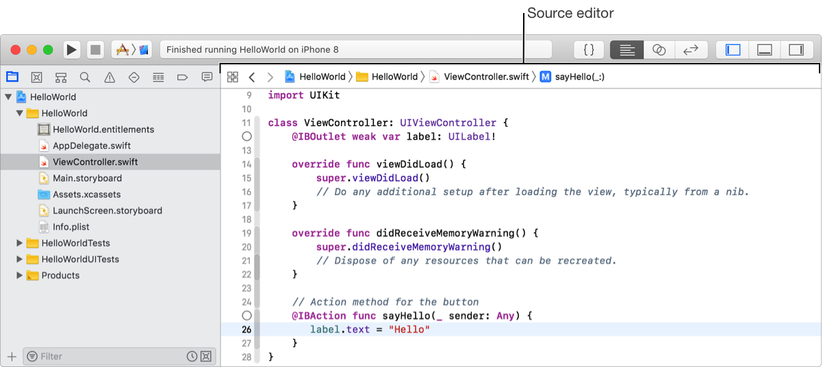 The source editor is where you write and edit code. To open the source editor, select a source file in the Project navigator.