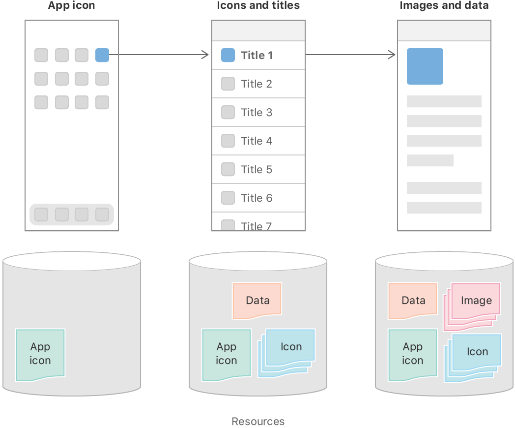 For example, a master-detail app may divide resources into levels and request the next level of resources only when the app anticipates that the user will move to that level. Similarly, the app can request In-App Purchase resources only when the user makes the corresponding in-app purchase.