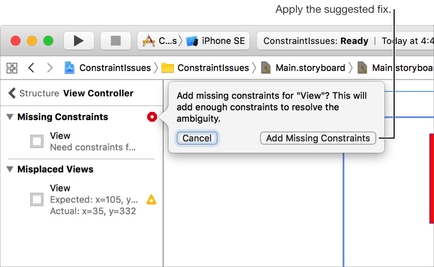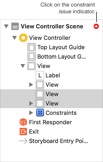 Use the Interface Builder canvas to find and resolve issues for one or more views. Use the outline view to find and resolve all of the issues for a view controller. Use the Auto Layout tools to resolve issues for the selected views.