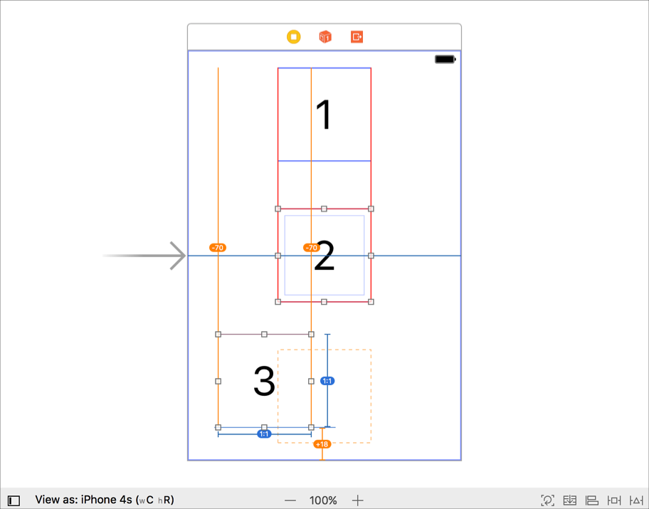 In the screenshot below, view 2 shows some constraints in red indicating Auto Layout errors. View 3 shows some constraints in orange indicating Auto Layout warnings.