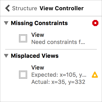 The outline view changes to show a categorized list of all of the Auto Layout warnings and errors for the view controller. Each category of warning or error can have multiple issues.