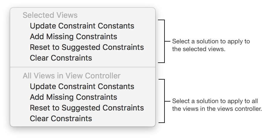The screenshot below shows an example of a solution popover for an Auto Layout error. The only choices are to apply the suggested solution or to cancel the fix.