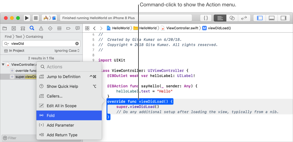 For example, to collapse a method or other structure, choose Fold. Alternatively, use the code folding ribbon to quickly fold and unfold structures. To show the code folding ribbon, open Text Editing preferences, click Editing, then select the “Code folding ribbon" checkbox. A grey ribbon appears in the gutter between the line numbers and the structures and comments you can fold. To fold a section of your code, hover the pointer over the adjacent ribbon, then click anywhere in the control that appears. For more code folding actions, choose Editor > Code Folding.
