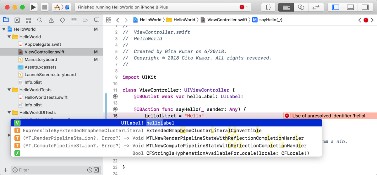 You can avoid most syntax errors by using code completion. When you begin typing the name of a symbol, Xcode offers inline suggestions for completing the name. Click an item in the suggestion list or use the Up Arrow or Down Arrow keys to select it. Then press Return to accept the suggestion.