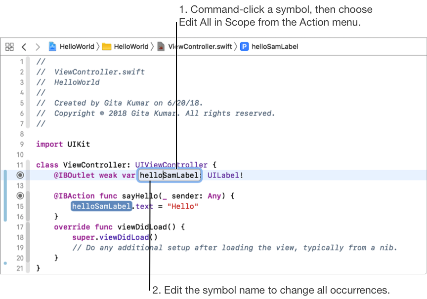 To edit all occurrences of a symbol in the current scope, Command-click the symbol, then choose Edit All in Scope from the Action menu. Xcode highlights all occurrences of the symbol in the current scope. As you edit the symbol, all occurrences of the symbol change. Press Return to accept the changes or Escape to cancel.