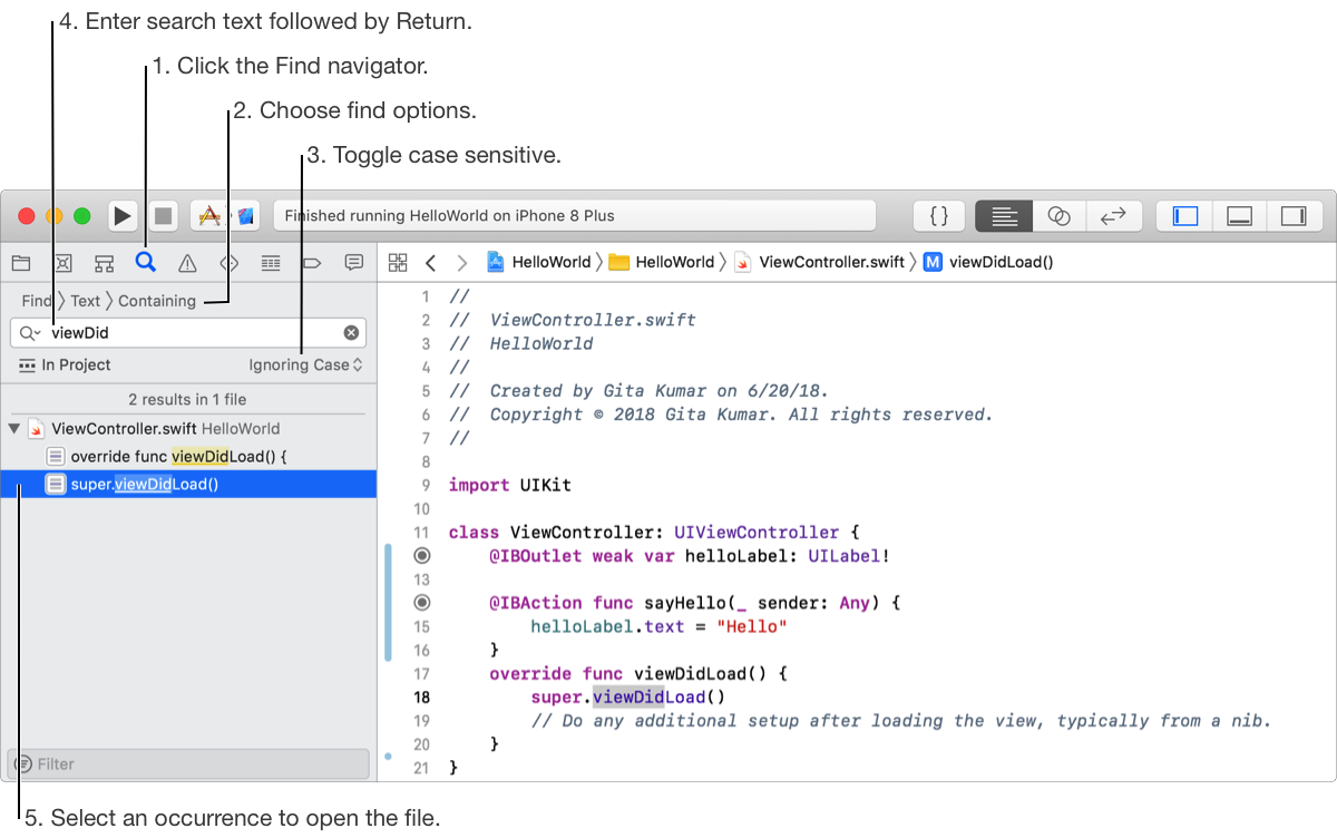 ) in the navigator area. Enter text in the search field followed by Return, and Xcode displays occurrences of the string in the entire project. Select an occurrence to view it in the editor area. To scope the search, above the text field, choose a string type and options. To find all occurrences that start with a string, choose Find > Text > Starting with. To find symbols that start with a string, choose Find > Definitions > Starting with.