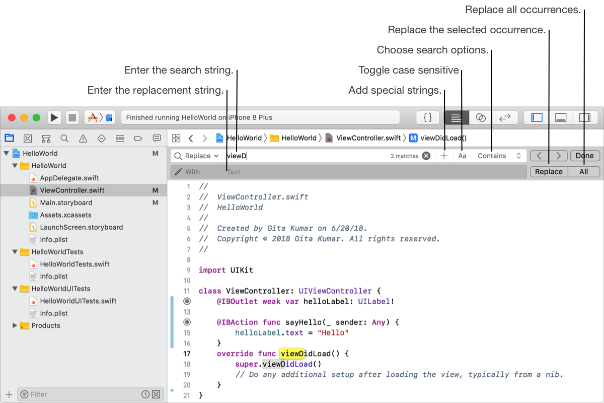 To find and replace text in the source editor, choose Find > Find and Replace (or press Option-Command-F). The search controls appear above the source file. As you type the search string in the Replace field, Xcode searches the file and highlights the occurrences of the string. Enter a replacement string in the With field. To narrow the search, use the controls on the right side of the Replace field. To add a URL, email address, or IP address, click the Add button (+), then choose a pattern from the pop-up menu. To learn what a control does, hover the pointer over it. To replace the occurrence and find the next one, click Replace. To replace all occurrences, click All.