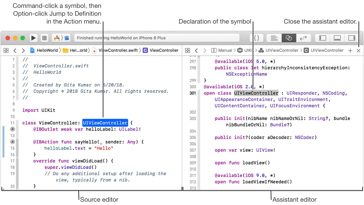 To view a symbol declaration, Command-click the symbol, then choose Jump to Definition from the Action menu. If there’s more than one definition for a symbol, select a file and line location from the dialog that appears. The file containing the definition is opened to the declaration of the symbol. To open the file in the assistant editor, hold the Option key when you choose Jump to Definition. To remove the assistant editor, click the close button in the upper-right corner.