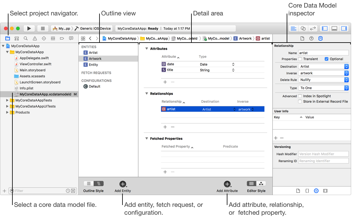 Use the Core Data model editor to change a Core Data entity-relationship model or schema (a file with a .xcdatamodeld file extension). To open the Core Data model editor, select a Core Data model file in the Project navigator and the file opens in the editor area.