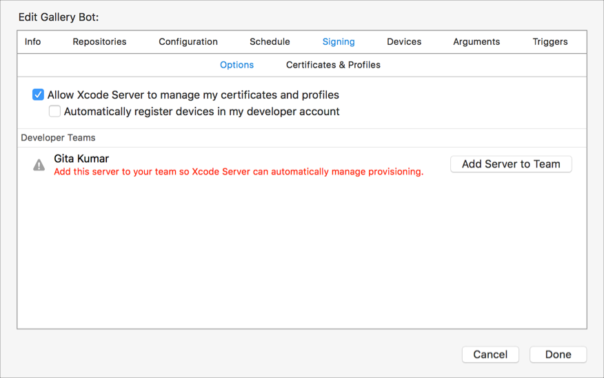 On the Options pane, select “Allow Xcode Server to manage my certificates and profiles.”