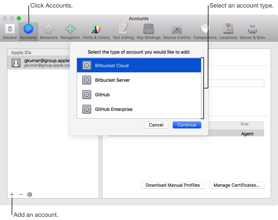 To open Accounts preferences, choose Xcode > Preferences and click Accounts.