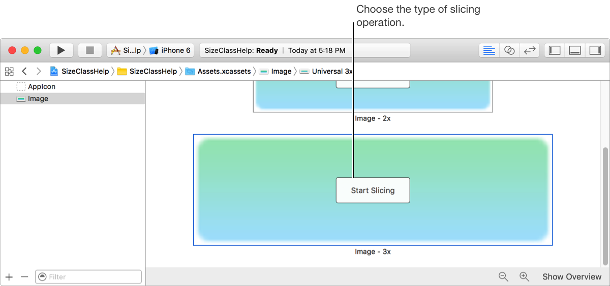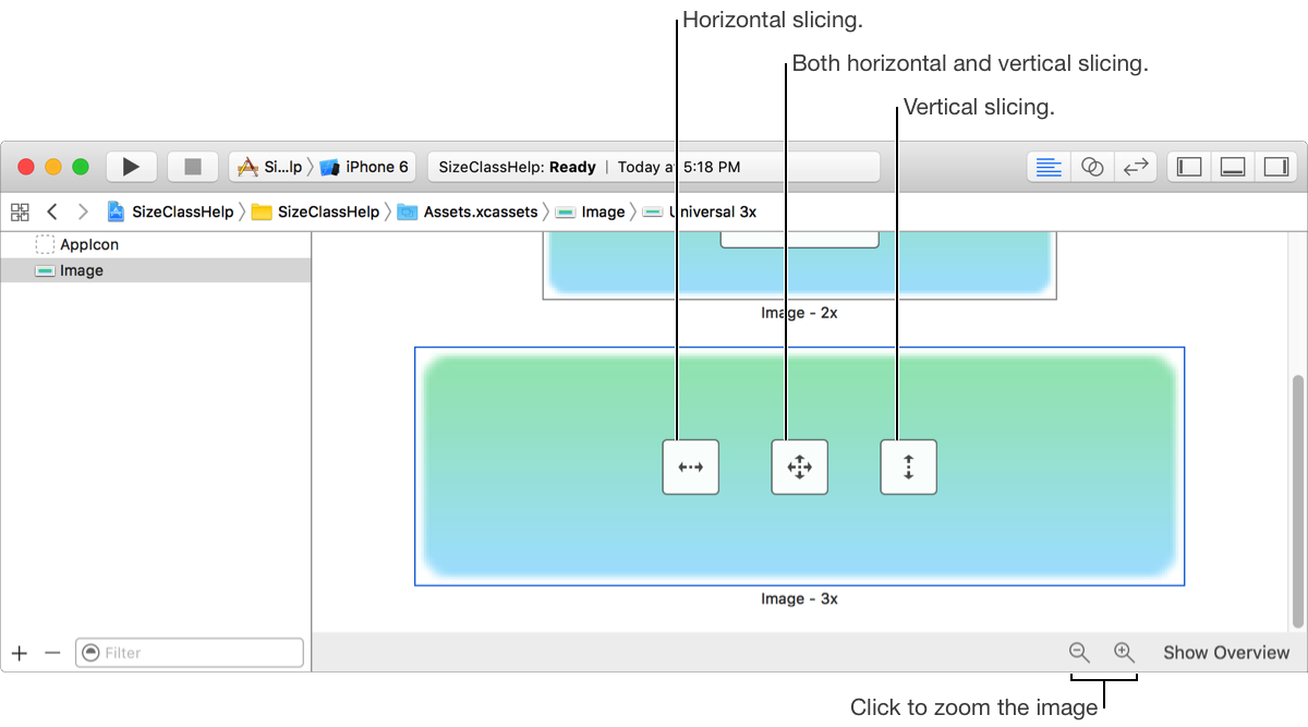 Use the Xcode Slicing feature to specify the dimensions of a resizable center area of an image and to optionally specify end caps, which are areas of the image that should not be filled by the resizable area