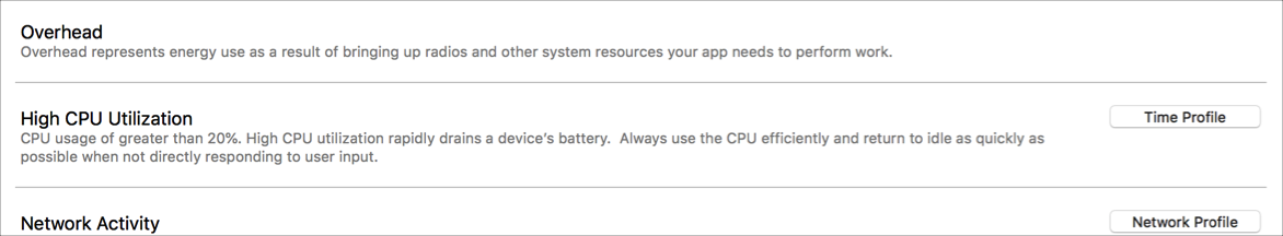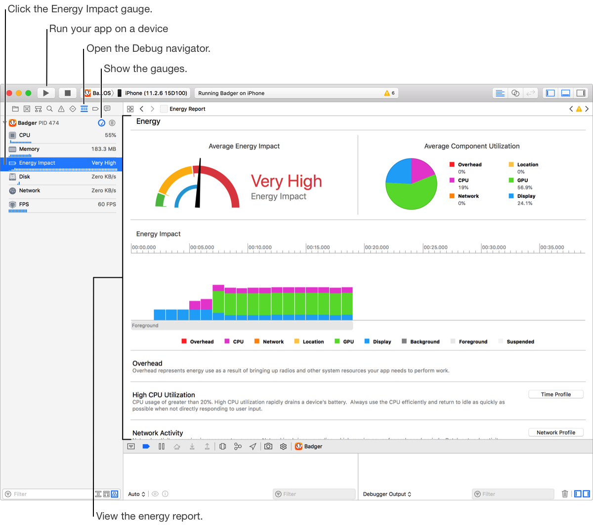 Use the Energy Impact gauge in the Debug navigator to monitor your app’s energy usage. This gauge only appears if you run your app on a real device.