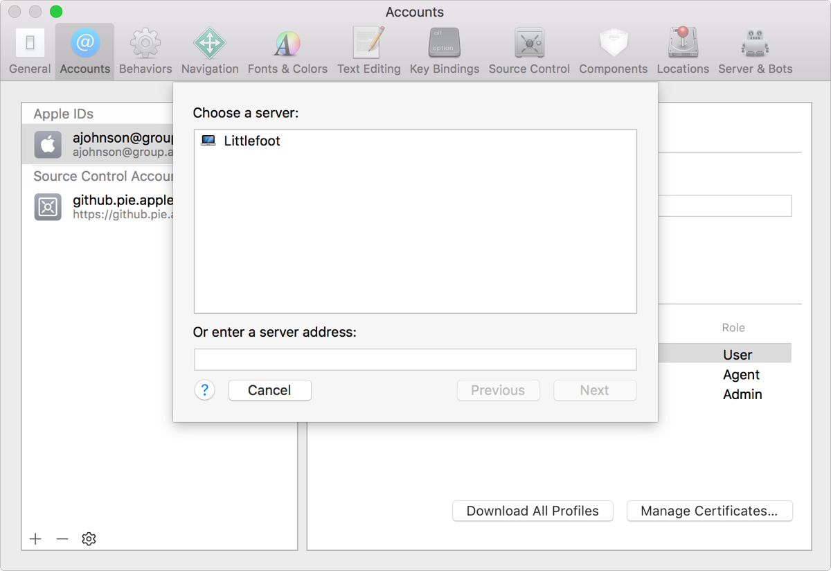 If you haven’t already done so, configure Xcode Server on a Mac that is reachable by all team members, and then on your development Mac, follow these steps to add the server to your accounts.