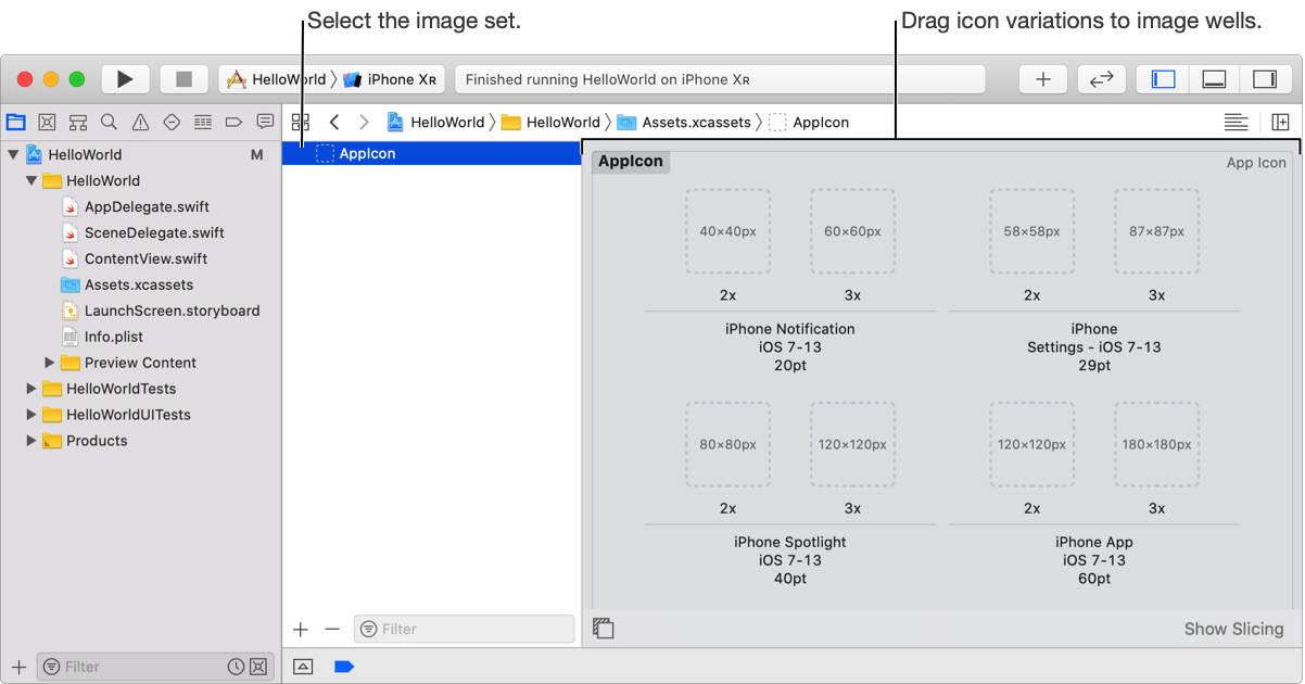Important: If you distribute your app through the App Store, you must provide a specific icon used to represent your app on the App Store. Go to Add an App Store icon. For iOS 11.0 apps and later, the app icon is required to be in an asset catalog.
