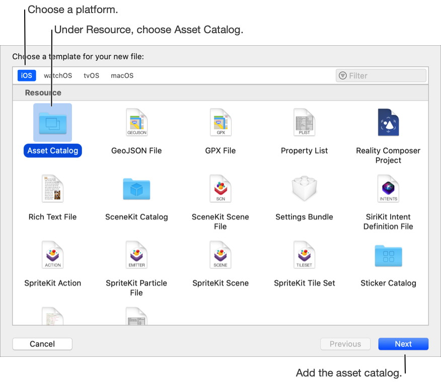 Add a new file from a template and in the sheet under Resource, select Asset Catalog and click Next. The new asset catalog will appear in the Project navigator and open in the editor area.