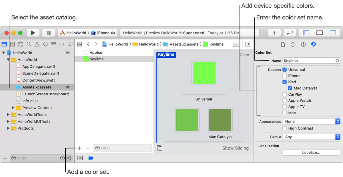 Choose New Color Set from the Add button (+) menu at the bottom of the outline view, or choose Editor > Add Assets > New Color Set.