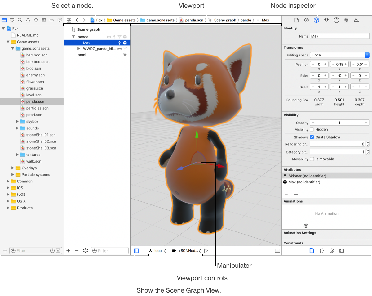 Using SceneKit scene editor, you can quickly build, edit, and preview games and interactive 3D apps. The visual interface reduces code, streamlines design, and helps you fine-tune the rendering of your apps. When you select a source file in the Project navigator, the file opens in the scene editor in the editor area.