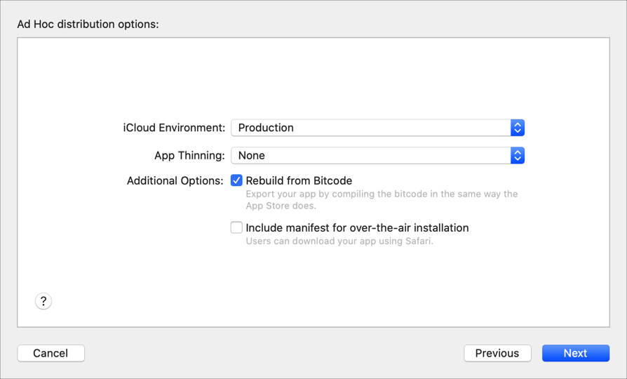 The type of certificate and provisioning profile used to sign the app depends on the distribution method you select. To learn about the distribution methods, go to Distribution methods.