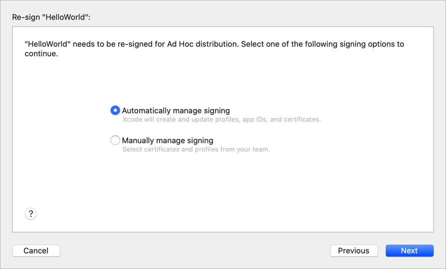 To learn about the signing options, go to Distribution signing options. If you select “Manually manage signing”, go to Manually manage distribution signing for alternate steps.