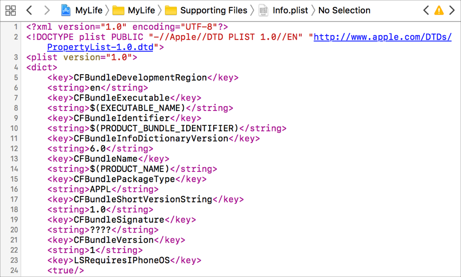 The property list editor supports many different types of property list files, each of which defines a specific set of possible keys. If Xcode can’t determine the type of a property list, you may need to specify its type manually.