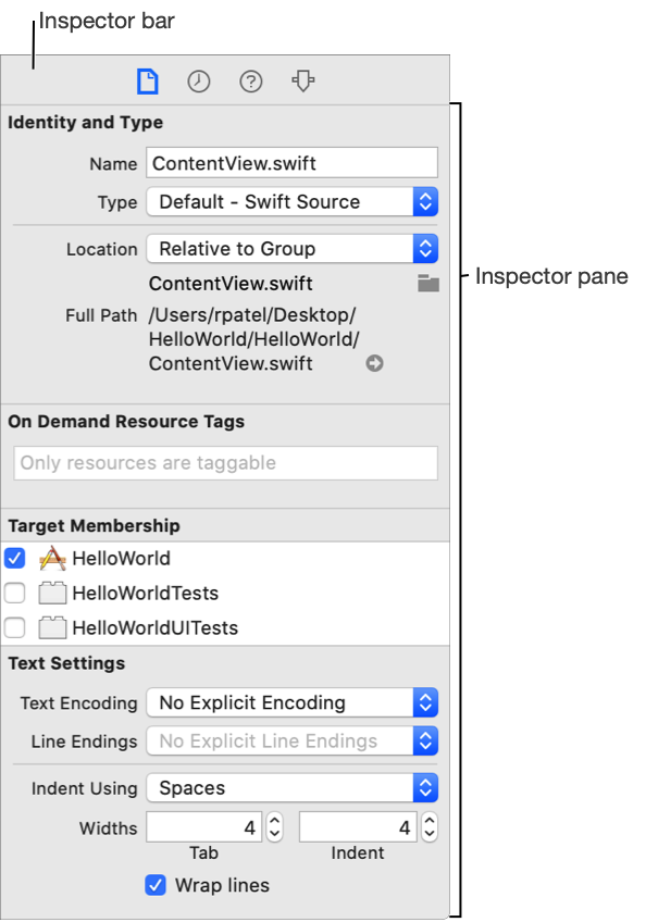 Use the inspector area to view and edit information for the selected object in the Project navigator or for the entire project. To open the inspector area, click the right button (