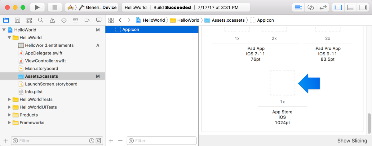 For iOS apps, drag an icon to the App Store iOS well located in the AppIcon image set.