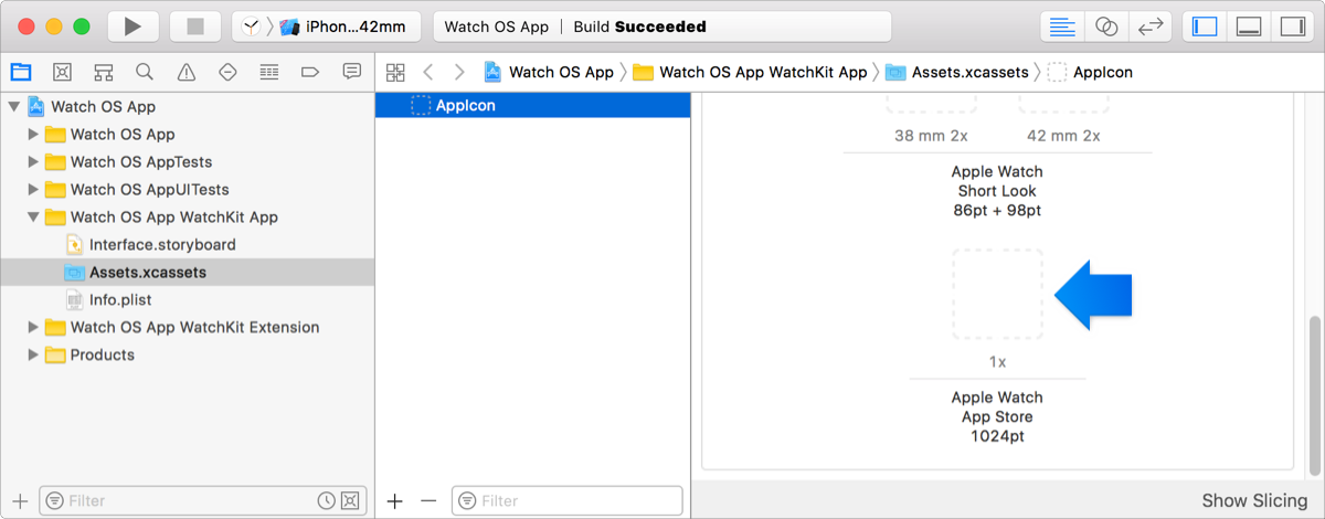 For the iOS target, drag an icon to the App Store iOS well located in the AppIcon image set. For the WatchKit App target, drag an icon to the Apple Watch App Store well located in the AppIcon image set.