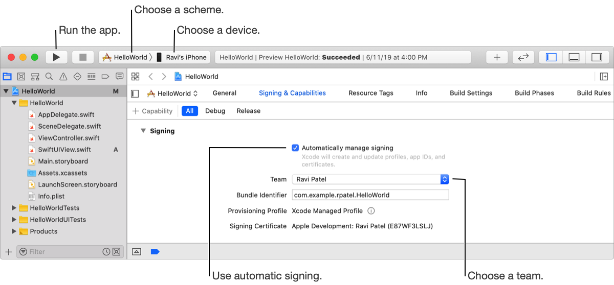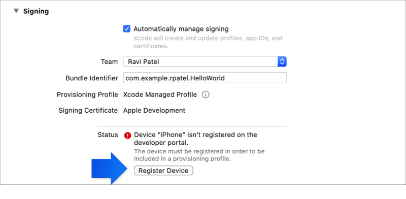 If you use automatic signing (recommended), Xcode creates the necessary signing assets for you in your developer account. If the team belongs to a developer program, you’ll need to explicitly register the device before you run the app. For macOS apps, you register the Mac running Xcode.