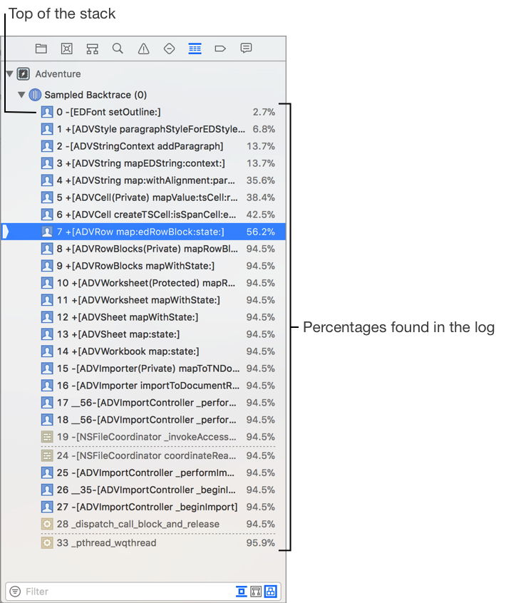 For a crash report, the Debug navigator opens to the stack frame where the crash occurred. The full backtrace for every thread is loaded into the Debug navigator and you can navigate the code similar to debugging a running app. For an energy report, the Debug navigator opens to the backtrace that contains the most samples without identifying threads. The top of the stack is shown first. The navigator also shows the percentages found in the log.