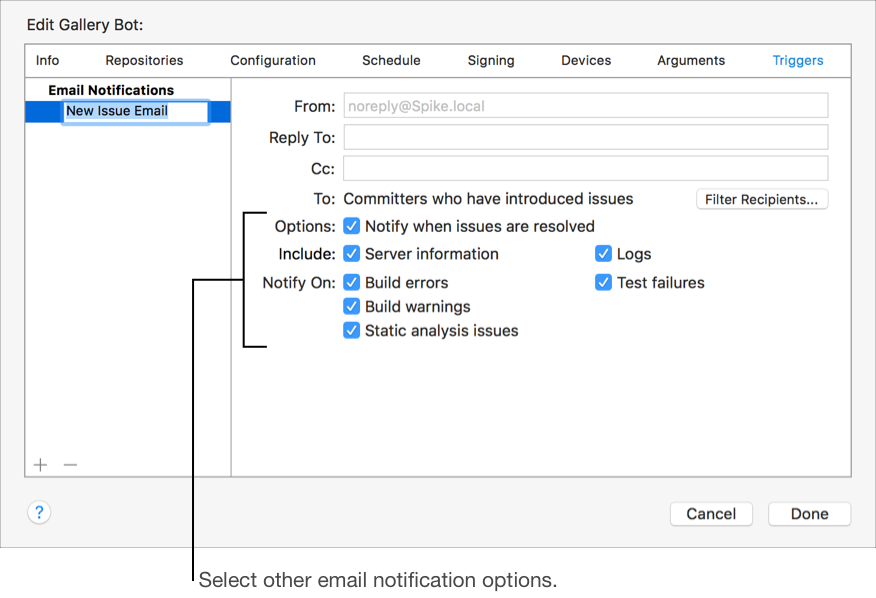 For periodic reports, specify whether you want email to go to committers. For new issue reports, emails automatically go to committers but you can specify whether to send email when issues are resolved too. Then select the information to include and the conditions under which reports are sent, such as on success, on test failures, on build errors, on build warnings, or on static analysis warnings.