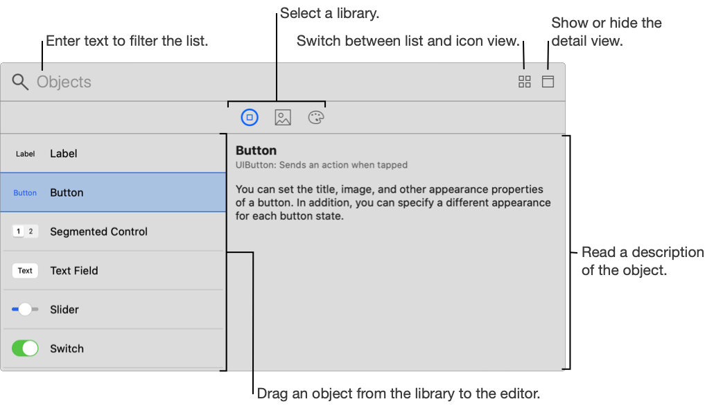Use the library to add objects to files or settings that you edit in the editor area of the main window. The libraries (collections of objects) shown in the library window depend on the type of editor, target platform, and other conditions.