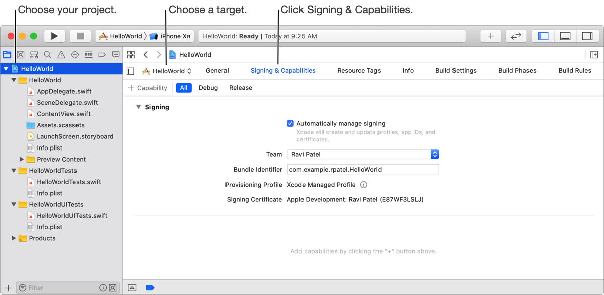 Before you begin, add your Apple ID account and assign the target to a team. For some apps, launch an app on a device to register a device.