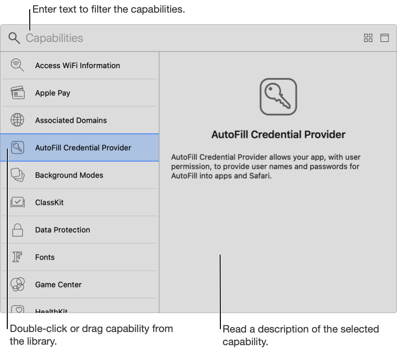 In the library, double-click the capability you want to add, or drag it to the Signing & Capabilities pane.