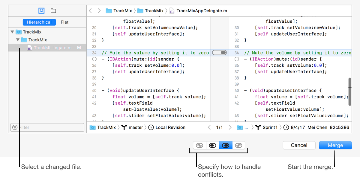 To specify which branch revision to use, select the file in the left column, then click a button in the segmented control under the comparison editor: